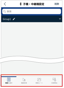 アプリがBluetooth通信で近くにある子機と中継機を検索してリスト表示します。対象機器をタップすると個別の設定画面を開きます。