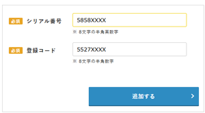 アカウントに登録する親機のシリアル番号と登録コードを入力したら、[追加する]ボタンをクリックします。