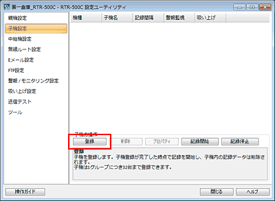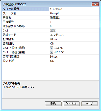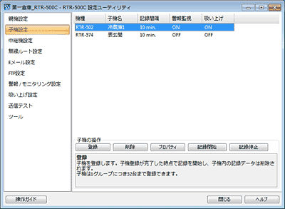 [記録間隔]・[警報監視]・[吸い上げ]など、一部の項目は子機登録後に