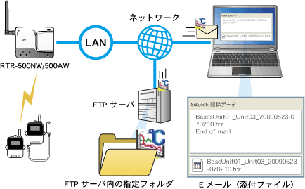 子機が測定した記録データを、指定した時間に吸い上げてEメールまたはFTPで送信することができます。